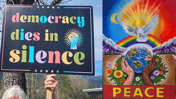 Similarly, the collective pains in our roots continue to show up in BIG ways! We are called as society and humanity to uproot the rotten and forgotten to allow our true brilliance and essence to SHINE! Here are 2 of my favorite signs from the No Kings gathering on 3/28 here in Mount Shasta. All across this nation and world, folks gathered in peace, creativity and communication to rise for the best and higher nature of who we truly be! The power of the people speaking to the people in power. We were voices for democracy and peace, voices of hope for decency and a disruption to the corruption and inhumane actions coming from our current administration.